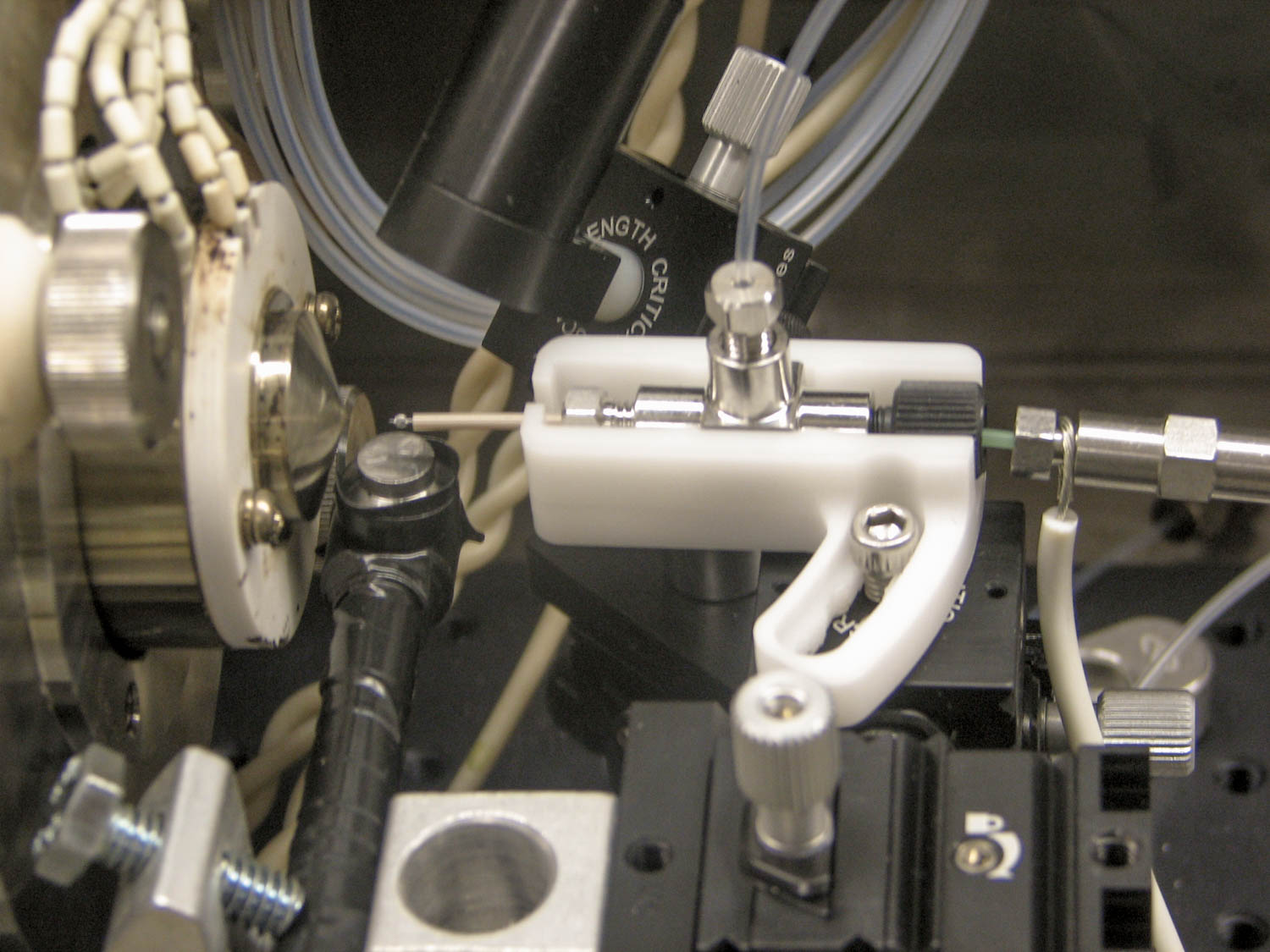 The Laser Bioanalytics deep ultraviolet laser ablaton microdissection system (DUV-LAM) uses the “cold” deep UV ablation method and irradiates the tissue spot by spot to disrupt the structure and eject the tissue components in the plume of ejected particulate material. The collected biomolecules are efficiently extracted and do not experience fragmentation or disruption of weak interactions.