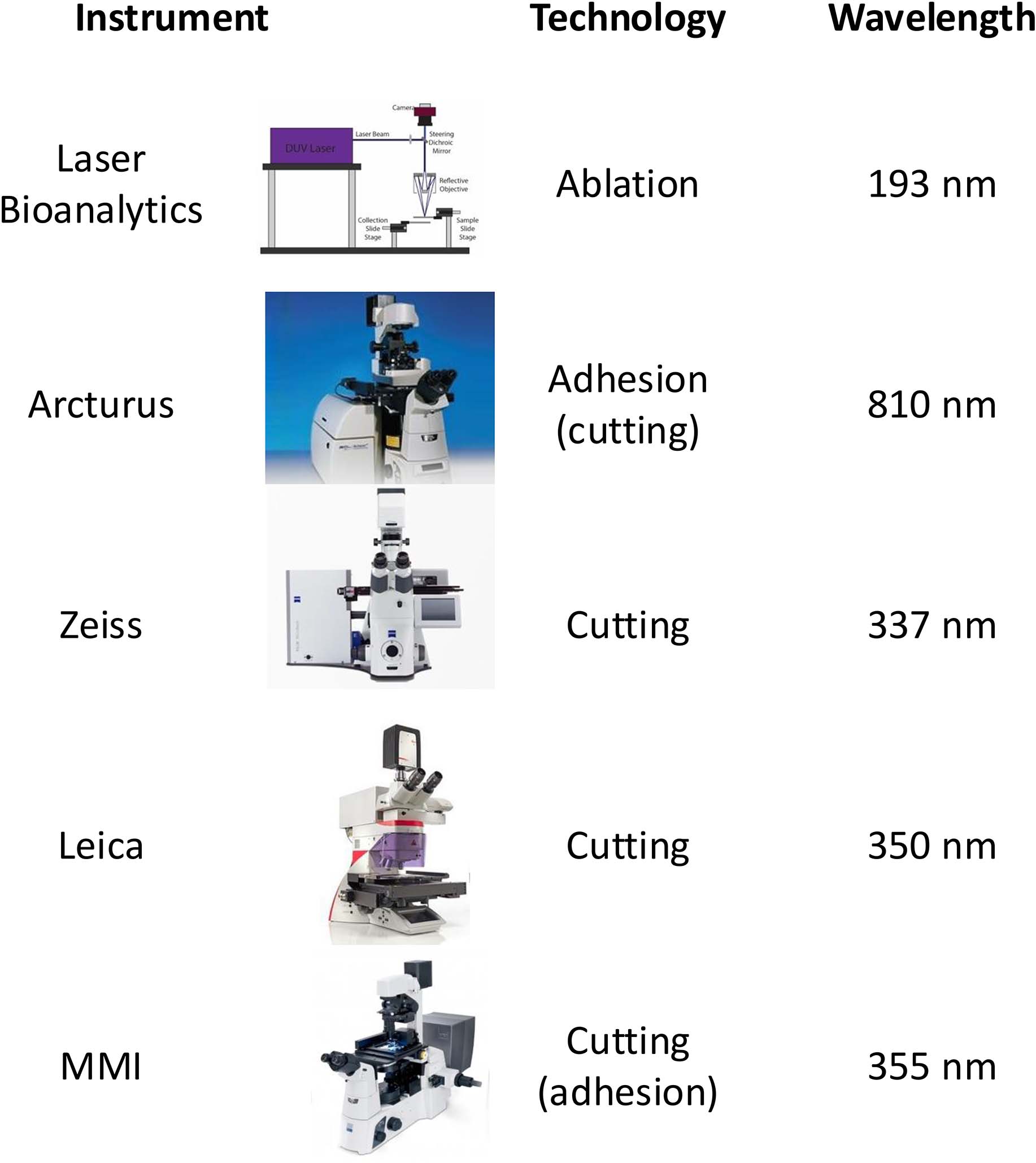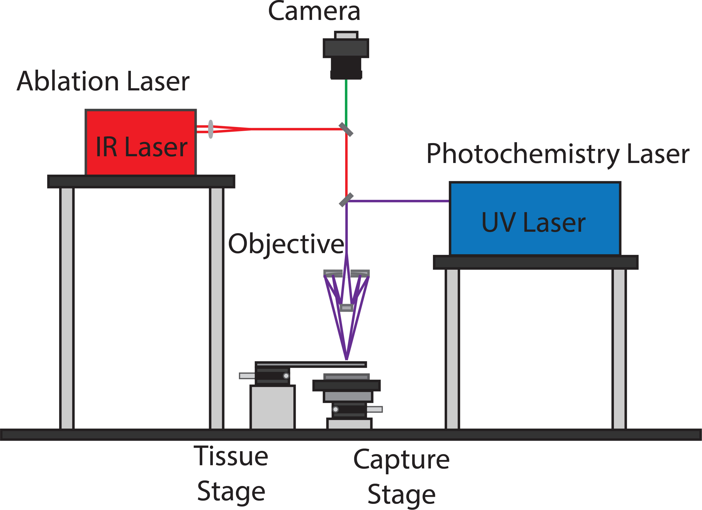 Currently commercial laser microdissection instruments use two methods for tissue region excision: laser cutting and tissue adhesion. Laser cutting uses a focused high energy laser to obliterate tissue at the perimeter of a tissue region of interest to separate a small solid mass of tissue from its surroundings. The isolated piece is separated from the bulk by an additional laser pulse or film adhesion. The high laser energy used for cutting can damage the tissue adjacent to the cut line and lysis and additional separation steps are required for extraction of biomolecules from the intact tissue pieces.